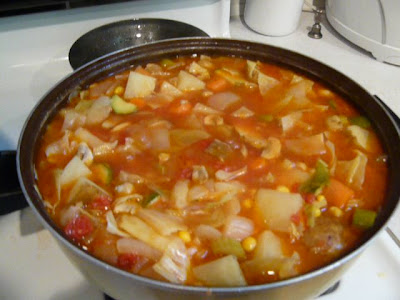 To the pepper oil, mushrooms and onions I added all the chopped ingedients along with a bag of frozen corn. This turned out to be more than this pot could handle...